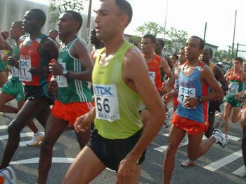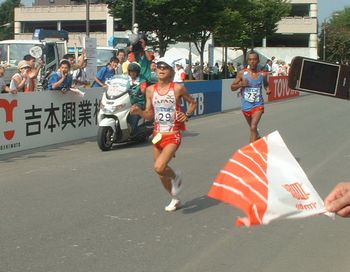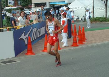 日本選手で一番先に長居陸上競技場入り口(40キロ地点)に帰ってきたのは、その尾形選手でした。
