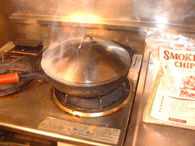 今回はフライパの中心部に火のついた炭を置き、周りに肉を置き、炭の上に木のくずをぱらぱらとまぶし、煙が流れないようにふたをすればいいだけである。
